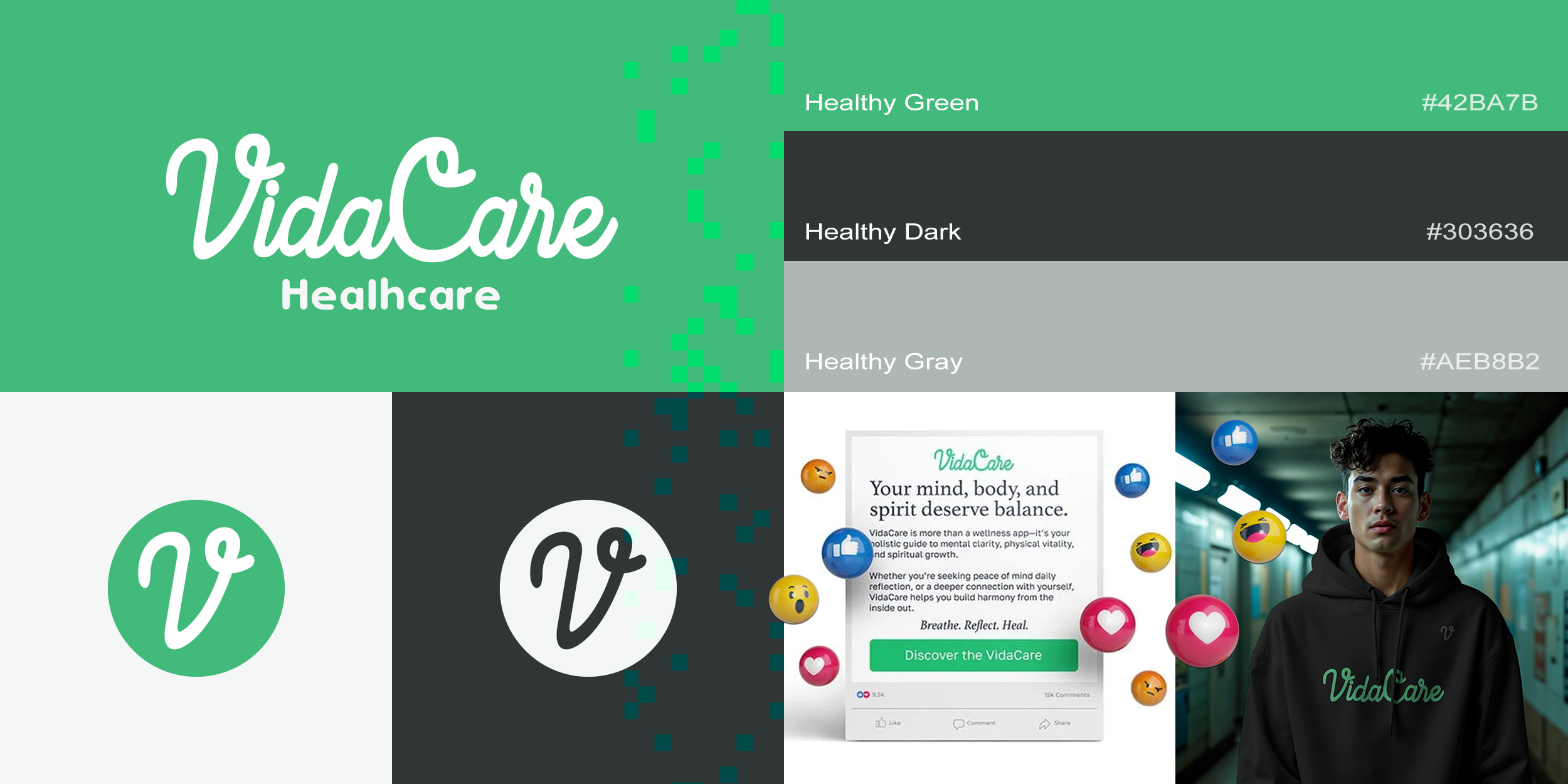 Together, the mark and colors reflect VidaCare’s mission to make holistic health accessible through mindful technology. The identity is clean, uplifting, and contemporary—capturing VidaCare not just as an app, but as a meaningful path toward harmony and wholeness.